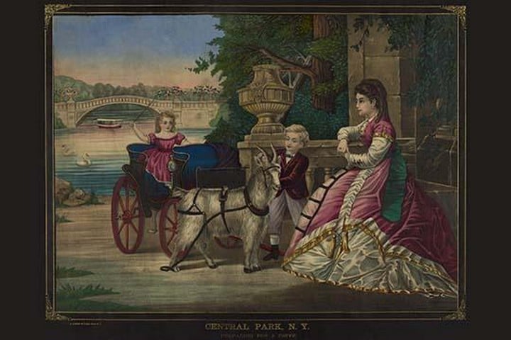 Preparing for a drive in Central Park. A young boy prepares his sister for a ride in the park with a buggy that is being pulled by a goat; a boat sits in the water in the pond in Central Park1873/USA