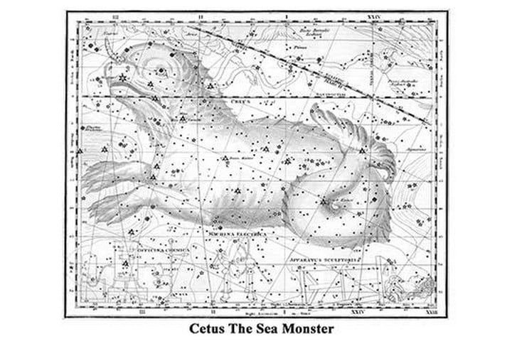 Cetus is a constellation. Its name refers to Cetus, a sea monster in Greek mythology, although it is often called ‘the whale’ today. Cetus is located in the region of the sky known as the Water, along with other watery constellations such as Aquarius, Pisces, and Eridanus.1822/London