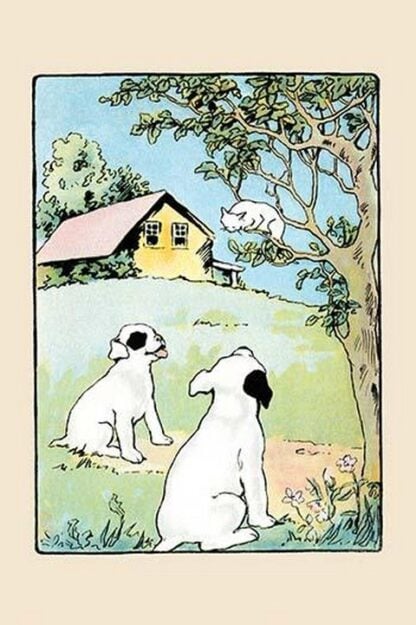 Two fox terriers chased a cat up a tree after romping on the lawn. An illustration from a series of children’s books which came free with the Public Ledger newspaper.1914/USA