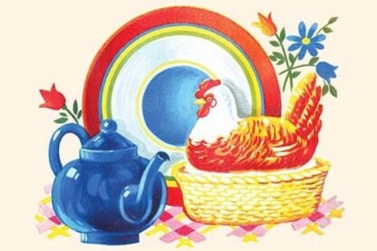 A plate and a teapot next to a chicken decorated casserole dish.. In the 1930’s the classic homemaker could purchase decals, applied by water, to decorate the kitchen, furniture, or anything else they desired. These are samples directly from the salesman’s sample book.1935/USA