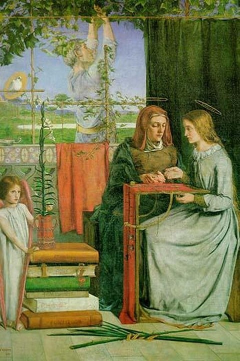 In his poem, ‘Mary’s Girlhood,’ Rossetti shows the Virgin Mary during childhood. ‘This is that blessed Mary, pre-elect, God’s Virgin.’ He then goes on to enumerate her many wonderful traits. Besides her ‘supreme patience’ and ‘simplicity of intellect,’ Rossetti paints her as ‘faithful and hopeful; wise in charity; strong in grave peace; in pity circumspect.’ All of these traits, however, have a somewhat jarring connotation., The Girlhood of Mary Virgin. In both, she appears as a somber, mature individual. Furthermore, even as in the poem she emerges as ‘an angel-watered lily, that near God grows and is quiet,’ in the painting she appears a beautiful young woman, yet dressed simply and, though attending a lesson, staring at an angel playing by some lilies.1849/Tate