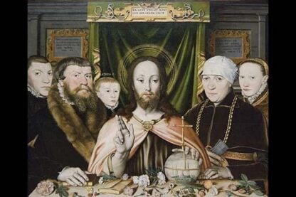 Christ Blessing, Surrounded by a Donor and His Family (Triptych of a Protestant Family), ca. 1575-80; formal portrait of an unidentified Westphalian family was made around 1575-80, perhaps on the occasion of the wedding of the unidentified man, whose age is indicated as thirty-three, and the woman, only eighteen, on the left and right wings. In keeping with this theme, the flowers strewn on the table before Christ symbolize love, commitment, faith, and possibly fertility, while the book nearby and those held by the men signal the habitual reading of the Holy Scriptures.1577/Metropolitan Museum, USA