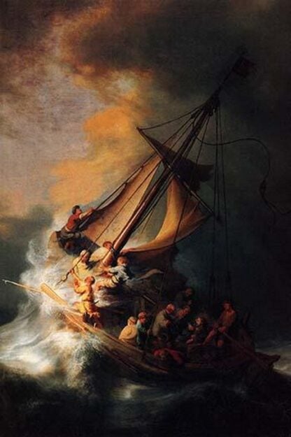 “Christ in the Storm on the Lake Genezareth” is a captivating painting by the renowned Dutch artist Rembrandt Van Rijn. Born on July 15, 1606, in Leiden, Netherlands, Rembrandt was a Dutch Baroque painter and printmaker, one of the greatest storytellers in the history of art. This painting, created in 1633, is among the largest and earliest of Rembrandt’s works. It depicts the biblical event in which Jesus calmed the storm on Lake Genezareth, also called the Sea of Galilee. The painting showcases a dramatic seascape in which Christ and his followers are embroiled in a struggle to gain control of their boat during an intense storm. The disciples, panic-stricken, awaken their slumbering Master: Jesus. His response is both commanding and serene. With authority over nature itself, He rebukes the elements, and instantly, the tempest subsides. The painting is noteworthy for its contrast of dark and light throughout, with two-thirds of the painting in darkness. Light emanates from the upper left of the painting, and a glimpse of the blue sky may be seen through the store. As the scene moves toward the right, the boat and the crew are thrown back into shadow. The close-up treatment of the subject and the painting’s overall composition are evocative of a print by Adriaen Collaert. The painting remains missing since its theft in 1990.