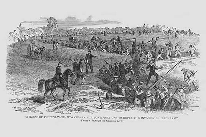 Frank Leslie was a prominent 19th-century American illustrator, publisher, and editor. He started as an illustrator for popular periodicals and established his own publishing company, “Frank Leslie’s Illustrated Newspaper,” which became one of the most successful and influential newspapers of its time. Leslie was also a pioneer in the use of photographs in journalism and established a photographic studio to create original images for his newspaper. He wrote several books and plays and was an important figure in the development of American media, shaping the way news was reported and disseminated. He died in 1880, leaving a lasting legacy.Citizens of Pennsylvania did trenches to repel Lee’s Army1863/USA