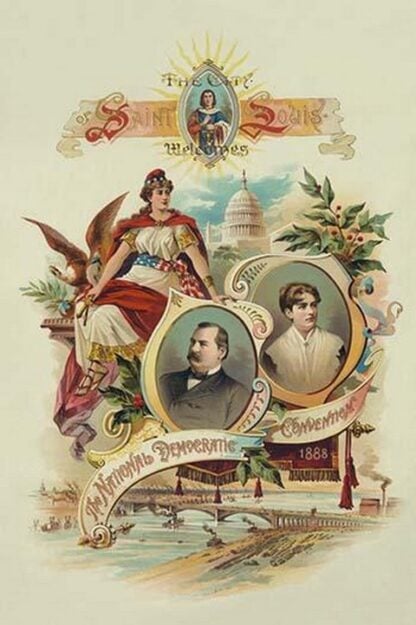 Presidential campaign convention poster with portraits of candidate President Grover Cleveland and his wife Frances Folsom Cleveland as well as symbols and images of Washington, DC; St. Louis, and America. Registered for copyright just days before the Democratic Convention.1888/USA