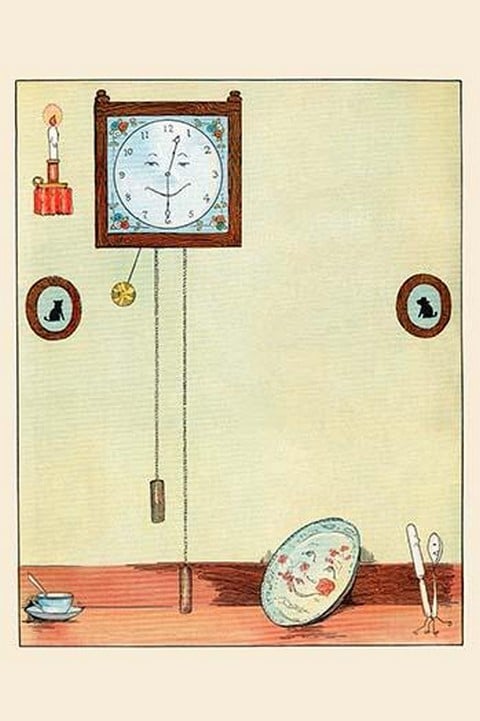 The clock smiles at the plate as the knife and spoon dance.1925/USA