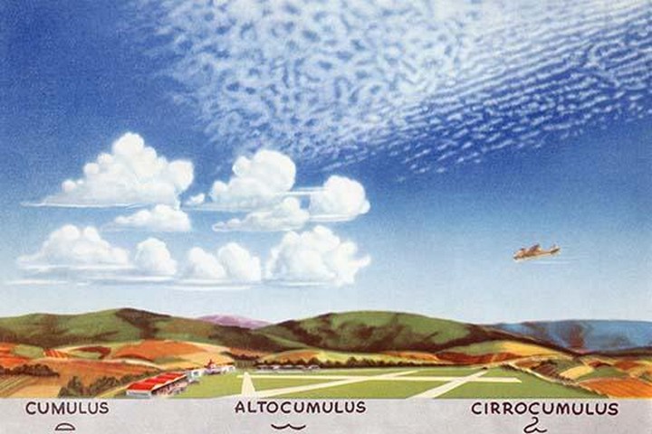 Cumulus, altocumulus, and cirrocumulus clouds as they appear at levels in the atmosphere.1954/USA