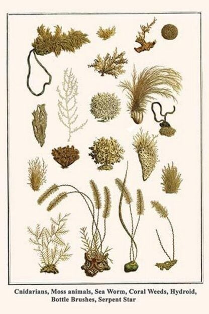 Cnidarians, Moss Animals, Sea Worm, Coral Weeds, Hydroid, Bottle Brushes, Serpent Star by Albertus Seba – Posters and prints on paper or canvas by standard digital or deluxe giclee printing.