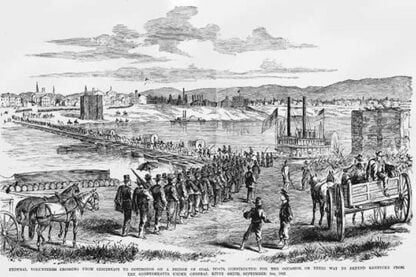 Frank Leslie was a prominent 19th-century American illustrator, publisher, and editor. He started as an illustrator for popular periodicals and established his own publishing company, “Frank Leslie’s Illustrated Newspaper,” which became one of the most successful and influential newspapers of its time. Leslie was also a pioneer in the use of photographs in journalism and established a photographic studio to create original images for his newspaper. He wrote several books and plays and was an important figure in the development of American media, shaping the way news was reported and disseminated. He died in 1880, leaving a lasting legacy.Coal Boat Bridge from Cincinnati to Covington to Defend KentuckySeptember 5, 1862/USA