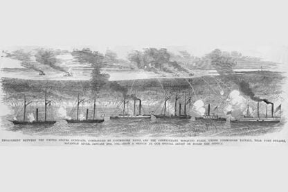 Frank Leslie was a prominent 19th-century American illustrator, publisher, and editor. He started as an illustrator for popular periodicals and established his own publishing company, “Frank Leslie’s Illustrated Newspaper,” which became one of the most successful and influential newspapers of its time. Leslie was also a pioneer in the use of photographs in journalism and established a photographic studio to create original images for his newspaper. He wrote several books and plays and was an important figure in the development of American media, shaping the way news was reported and disseminated. He died in 1880, leaving a lasting legacy.Commodore Davis’ Fleet engage the Mosquito Fleet of Commodore TatnallJanuary 28, 1862/USA