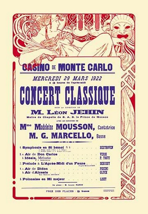 Alphonse Maria Mucha (1860-1939) was a Czech Art Nouveau painter. However, he did a great many posters and prints. The period of his work has become known as the Belle Epoque. Simple advertising poster for Monte Carlo’s famous casino.1922/France