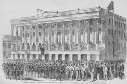 Frank Leslie was a prominent 19th-century American illustrator, publisher, and editor. He started as an illustrator for popular periodicals and established his own publishing company, “Frank Leslie’s Illustrated Newspaper,” which became one of the most successful and influential newspapers of its time. Leslie was also a pioneer in the use of photographs in journalism and established a photographic studio to create original images for his newspaper. He wrote several books and plays and was an important figure in the development of American media, shaping the way news was reported and disseminated. He died in 1880, leaving a lasting legacy.Confederate General McGowan addresses South Carolina Abbeville Volunteers in from of the Charleston Hotel1861/USA