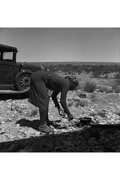 Young Negro wife cooking breakfast, outskirts of El Paso, Texas. ‘Do you suppose I’d be out on the highway cooking my steak if I had it good at home?’ Occupations: hotel maid, cook, laundress1938/USA