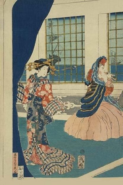 Japanese print shows courtesans in a western-style building of Yokohama. Done by Utagawa Sadahide (1807-1873) in 1861.1861/Japan