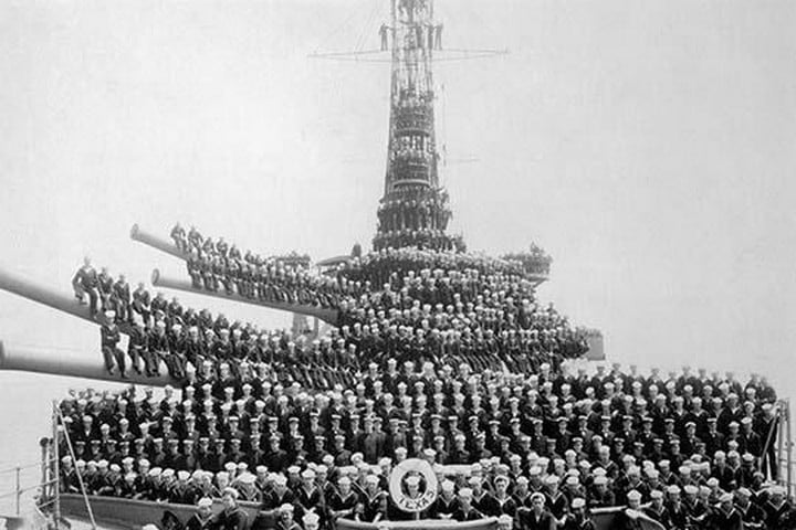 629 of the 1052 compliment of sailors pose on the deck of the USS Texas (BB-35). They sit on the massive 14 inch guns on this U.S. Navy battleship. The Texas was commissioned in 1914 and fought in combat through World War II.Unknown Date/USA