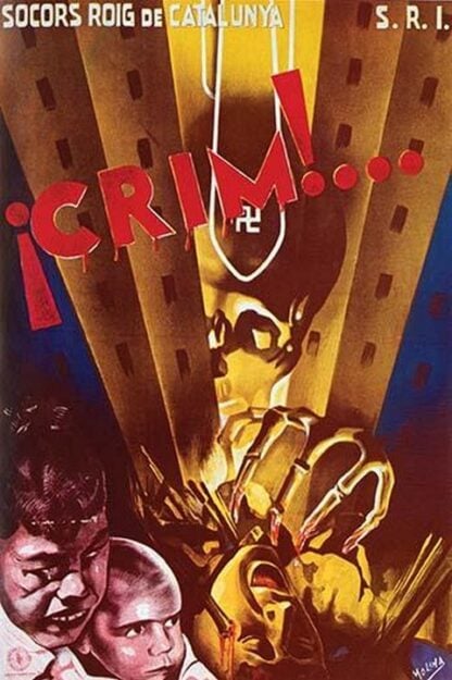 Crim!. Nazi Bombs fall on Catalonia with a skull of death a skeletal hands as children cry under the onslaught1939/Spain