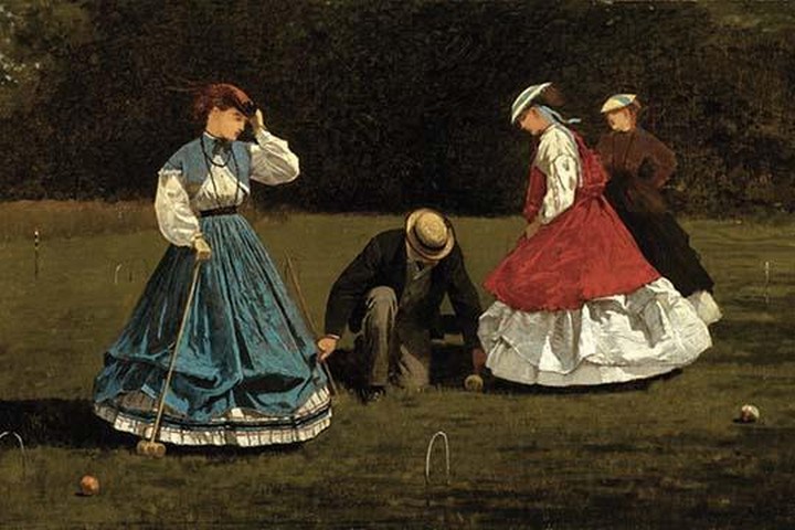 Croquet, a fad in the United States by the mid-1860s, was appreciated as a healthful outdoor activity that invited men and women to compete on equal terms as well as to visit and flirt with one another. Here, a man observes the expected courtesies by assisting his female companions in the game. He is sandwiched between two of them, who wear stylish dresses brightly colored in a patriotic palette and tower over him. Homer’s apparently pleasant afternoon of play also implies the uncertain terrain of relationships between American men and women. At this time, women were evaluating the choice between their traditional roles as wives and mothers and their new opportunities for education and employment that emerged following the loss of so many men in the Civil War, growing urbanization and industrialization, and the burgeoning women’s movement.1866/Art institute of Chicago