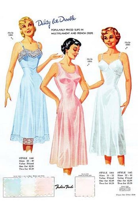 Popularly priced slips in multifilament and French crepe. Fashion plates of the latest styles complete with sample fabric from a book sent only to retailers to choose their seasonal collections.1940/USA