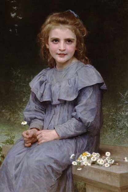 “Pâquerettes”, also known as “Daisies”, is a captivating painting by the French academic painter William-Adolphe Bouguereau. Created in 1894, this oil-on-canvas masterpiece measures 36 x 22 inches (91.5 x 56 cm) and resides in a private collection. William-Adolphe Bouguereau (1825-1905) was a prominent French academic painter known for his realistic genre paintings and mastery of the human form. Bouguereau’s work is characterized by its meticulous attention to detail, smooth brushwork, and idealized depictions of the human body, particularly female nudes. His subjects often included mythological themes, rural and domestic scenes, and religious motifs, all executed with a high degree of technical precision and beauty. He was adept at rendering textures, such as skin and fabrics, and his compositions often conveyed a serene and harmonious atmosphere. During his career Bouguereau enjoyed significant acclaim and success. He exhibited regularly at the Paris Salon, where he received numerous awards and honors. His paintings were sought after by collectors and patrons, and he was regarded as a leading figure in the academic art world of the 19th century. Despite his popularity during his lifetime, Bouguereau’s work fell out of favor with the rise of modernist movements in the early 20th century, which critiqued his adherence to traditional techniques and themes. In recent decades, there has been a resurgence of interest in Bouguereau’s work, with contemporary audiences and critics recognizing his technical skill and contributions to art.1894/Private