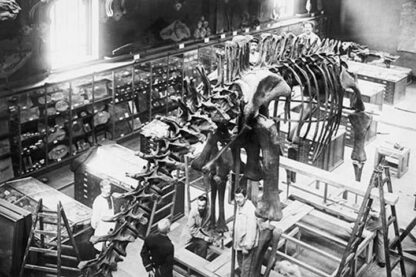 Goggeshall, Holland, and Balie (director), with museum workers on Carnegie Diplodocus, Paris; Curators pictured with assembled skeleton1910/France
