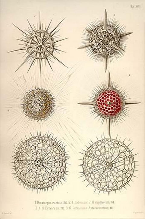 Dorataspis Costata, Haliomma, H.Capillaceum, H. Erinaceus, Actinomma Asteracanthion by Ernst Haeckel – Posters and prints on paper or canvas by standard digital or deluxe giclee printing.