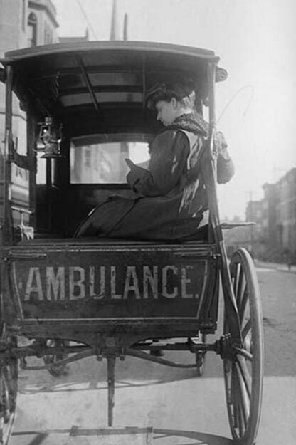 Dr. Elizabeth Bruyn sits in the rear of her Horse Drawn Ambulance1911/USA