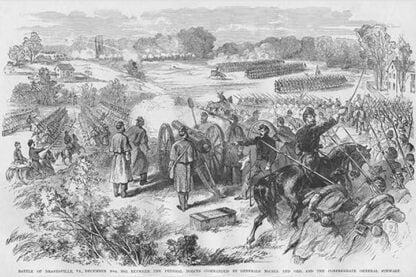 Frank Leslie was a prominent 19th-century American illustrator, publisher, and editor. He started as an illustrator for popular periodicals and established his own publishing company, “Frank Leslie’s Illustrated Newspaper,” which became one of the most successful and influential newspapers of its time. Leslie was also a pioneer in the use of photographs in journalism and established a photographic studio to create original images for his newspaper. He wrote several books and plays and was an important figure in the development of American media, shaping the way news was reported and disseminated. He died in 1880, leaving a lasting legacy.Battle of Dranesville, VirginiaDecember 20, 1862/USA