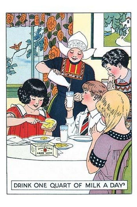Four children at a table enjoy their meal to come as a Dutch girl pours a glass of milk for a boy.1926/USA