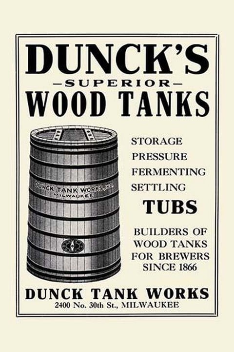 An advertisement for Dunck Tank Works, Milwaukee, Wisconsin, makers of brewers tanks since 1866.1933/USA