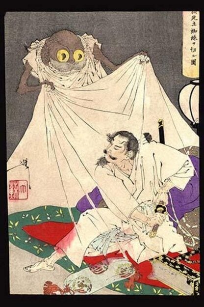 Ukiyo-e print illustration showing a man with a sword about to fend off an attacking ‘earth spider.’ Tsuchigumo1882/Japan