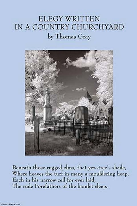 Elegy Written in a Country Churchyard’ is as the title indicates an elegy. Such a poem centers on the death of a person or persons and is, therefore, somber in tone. An elegy is lyrical rather than narrative-that is, its primary purpose is to express feelings and insights about its subject rather than to tell a story. Typically, an elegy expresses feelings of loss and sorrow while also praising the deceased and commenting on the meaning of the deceased’s time on earth. Gray’s poem reflects on the lives of humble and unheralded people buried in the cemetery of a church. The poem is illustrated by a photo of an Alabama cemetery by Carol Highsmith and was shot in infrared.1750/England
