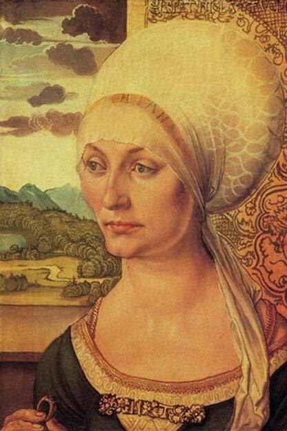 “Elsbeth Tucher” is a captivating portrait by Albrecht Dürer, a renowned German artist of the Renaissance period. Painted in the early 16th century, this exquisite artwork portrays Elsbeth Tucher, the daughter of a prominent Nuremberg patrician.Dürer’s meticulous attention to detail and mastery of portraiture are evident in this painting, as he captures Elsbeth’s likeness with remarkable precision and sensitivity. The young girl is depicted with a serene expression and a sense of quiet dignity, reflecting both her social status and her inner character.Through his skillful use of light and shadow, Dürer imbues the portrait with a sense of depth and realism, bringing Elsbeth Tucher to life on the canvas. The painting serves as a timeless testament to Dürer’s artistic genius and his ability to capture the essence of his subjects with unparalleled insight and empathy.1500/Germany
