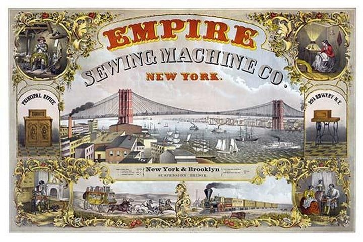 Views of New York & Brooklyn Suspension Bridge, sewing machines, people sewing by hand and with sewing machines, and transportation by stagecoach and railroad train.1870/USA