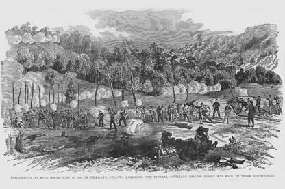 Frank Leslie was a prominent 19th-century American illustrator, publisher, and editor. He started as an illustrator for popular periodicals and established his own publishing company, “Frank Leslie’s Illustrated Newspaper,” which became one of the most successful and influential newspapers of its time. Leslie was also a pioneer in the use of photographs in journalism and established a photographic studio to create original images for his newspaper. He wrote several books and plays and was an important figure in the development of American media, shaping the way news was reported and disseminated. He died in 1880, leaving a lasting legacy.Engagement at Kulp House in Sherman’s Atlanta Campaign-Driving Hood’s men back to their earthworksJune 22, 1864/USA