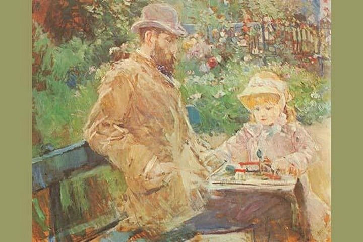 Eugene Manet and his daughter in Bougival on a bench in the park playing with a toy on a table1875/France