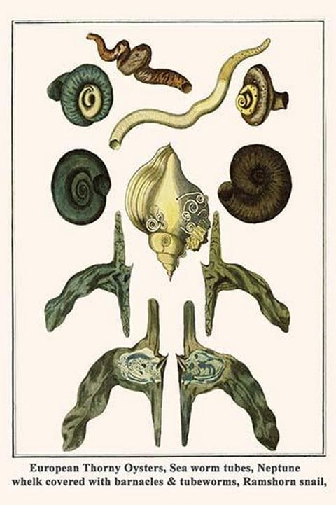 European Thorny Oysters, Sea Worm Tubes, Neptune Whelk Covered withBarnacles & Tubeworms, Ramshorn Snail by Albertus Seba – Posters and prints on paper or canvas by standard digital or deluxe giclee printing.