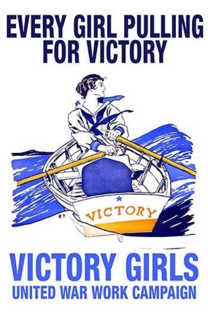 A young woman rowing a rowboat. For the Victory Girls United War work campaign. Edward Penfield (1866-1925) was prolific illustrator for many American publications like Harpers, Scribner’s, Colliers, and Saturday Evening Post.1918/USA