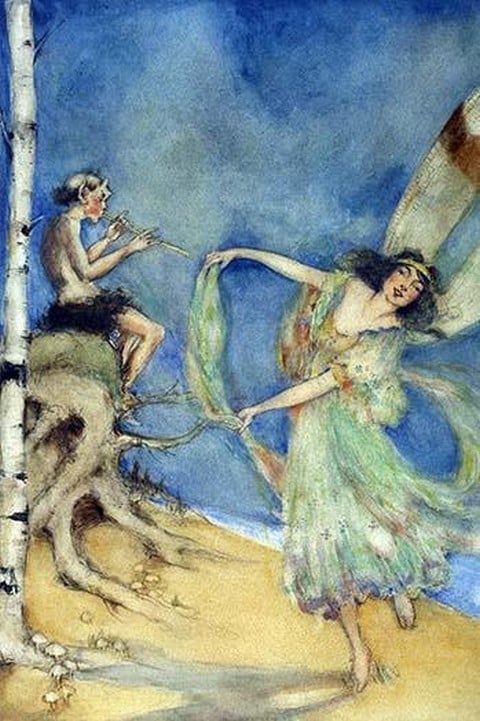 Illustration of a fairy for a children’s book showing a fairy dancing to the music on a pan flute played by a satyr.1920/USA
