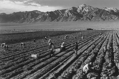 Farm workers harvesting crops in field, mountains in the background. Ansel Easton Adams (1902-1984) was an American photographer, best known for his black-and-white photographs of the American West. During part of his career, he was hired by the US Government to record life in the West.1943/USA