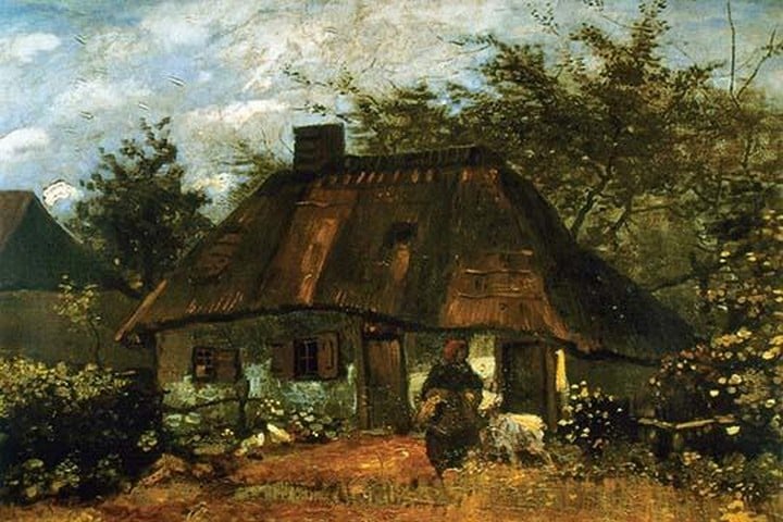 Vincent van Gogh’s “Farmhouse in Nuenen,” painted in 1885, is a poignant depiction of rural life in the Dutch countryside, reflecting the artist’s deep connection to his homeland and his empathy for the agrarian community. The painting features a humble farmhouse, its thatched roof blending harmoniously with the surrounding landscape. Van Gogh’s use of earthy tones and somber colors conveys the simplicity and austerity of rural existence. The scene is rendered with his characteristic impasto technique, where thick layers of paint create a textured, almost tangible surface that brings the rustic setting to life. The farmhouse, central to the composition, stands as a testament to the enduring human spirit and the hard work of the peasant farmers. Van Gogh’s attention to detail in the architecture and the natural environment highlights his reverence for the rural way of life. The composition is balanced by the gentle curvature of the trees and the soft, diffused light that imbues the scene with a sense of tranquility and timelessness. Through “Farmhouse in Nuenen,” van Gogh captures not only a physical landscape but also an emotional and cultural one, portraying the dignity and resilience of the people who inhabit it. This painting, created during a period of intense personal and artistic development for van Gogh, showcases his evolving style and his commitment to depicting the world with honesty and compassion. “Farmhouse in Nuenen” stands as a significant piece in van Gogh’s oeuvre, embodying his profound connection to the land and the people of Nuenen.