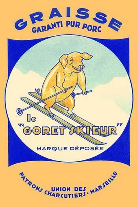 A vintage label for a can or lard or pork showing a pig riding skis down a slope. The label reads ‘Graisse Granati Pur Porc’Unknown Date/France