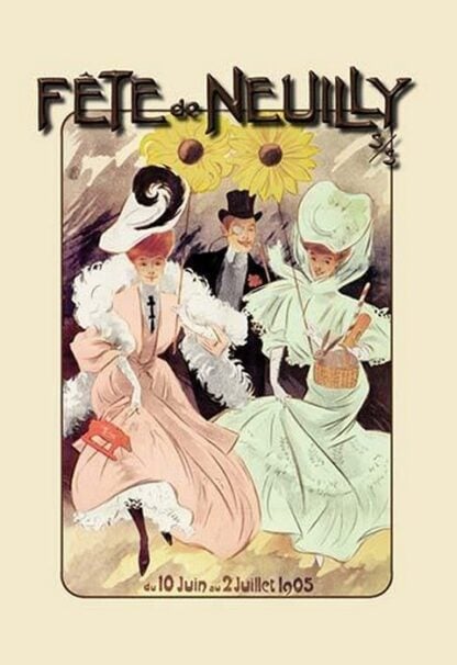 Like most of the poster artists of his generation Ferdinano ‘Misti’ Mifliez (1865-1923) was basically a painter who switched to the nascent medium of lithography because the popular new outdoor advertisers were looking for talent. He ultimately created a large number of posters for cycles, liqueurs and department stores. For several years in a row he also produced the posters for the Fete de Neuilly<> (or Fete a Neu-Neu<>), a festival in the neighborhood where he was living. This popular fair, which stretched from the Porte Maillot to the Seine, continued running through the 1960s. Misti, in his usual, classic style shows two very elegant women being followed around by a dandy. They are carrying goodies from the fair (candies, a rabbit, toys and two gigantic flowers), but that is clearly not what the ‘gentleman’ is interested in. As Neuilly is located in the fashionable west side of Paris, the fair was generally attended by the upper classes, and this poster is clearly aimed at them. 1905/France
