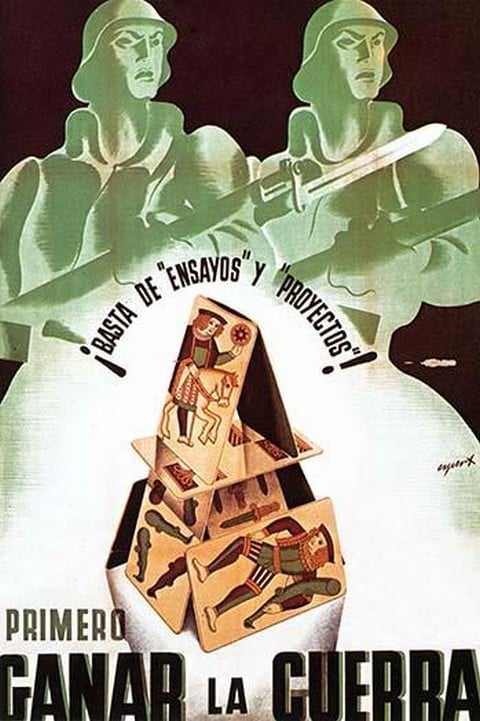 Soldiers overlook a deck of cards. Basta de Ensayos y Proyectos! Primero Ganar La Guerra1937/Spain