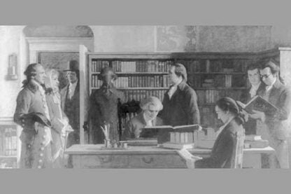Reproduction of painting by Charles E. Mills of Franklin opening 1st subscription library in Philadelphia1914/USA