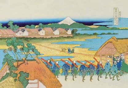 “Fuji Seen in the Distance from Senju Pleasure Quarter” is a captivating piece from Katsushika Hokusai’s renowned series “Thirty-six Views of Mount Fuji.” Created during the Edo period in Japan, this woodblock print showcases Hokusai’s exceptional talent in capturing the majestic presence of Mount Fuji within the context of everyday life. Set against the backdrop of the bustling Senju Pleasure Quarter, the iconic silhouette of Mount Fuji rises prominently in the distance, its snow-capped peak towering above the surrounding landscape. Hokusai masterfully balances the intricate details of the urban scene with the serene beauty of the natural world, creating a harmonious composition that reflects the interconnectedness of human civilization and the sublime power of nature. The vibrant colors and dynamic lines convey a sense of energy and movement, drawing the viewer’s gaze towards the majestic mountain that dominates the horizon. Through this work, Hokusai not only celebrates the awe-inspiring beauty of Mount Fuji but also captures the spirit of daily life in Edo-period Japan, where the presence of the sacred mountain served as a constant source of inspiration and reverence. “Fuji Seen in the Distance from Senju Pleasure Quarter” is a testament to Hokusai’s enduring legacy as one of Japan’s most iconic artists, whose innovative approach to composition and keen observation of the world around him continue to inspire generations of artists and art lovers alike.