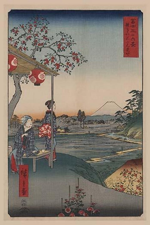 Two women at an outdoor teahouse stall at Zo?shigaya with Mount Fuji in the distance. From the series: Fuji sanju?rokkei : The Thirty-six views of Mount Fuji. Done by Utagawa Hiroshige (1797-1858) around 1858.1858/Japan