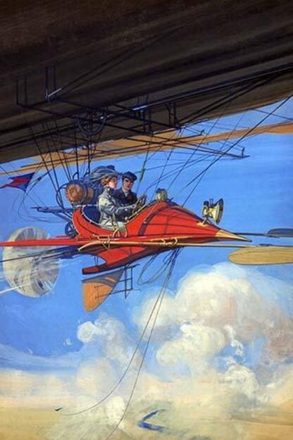 a woman at the wheel of a futuristic aircraft. A man sits beside her.1905/Unknown Place