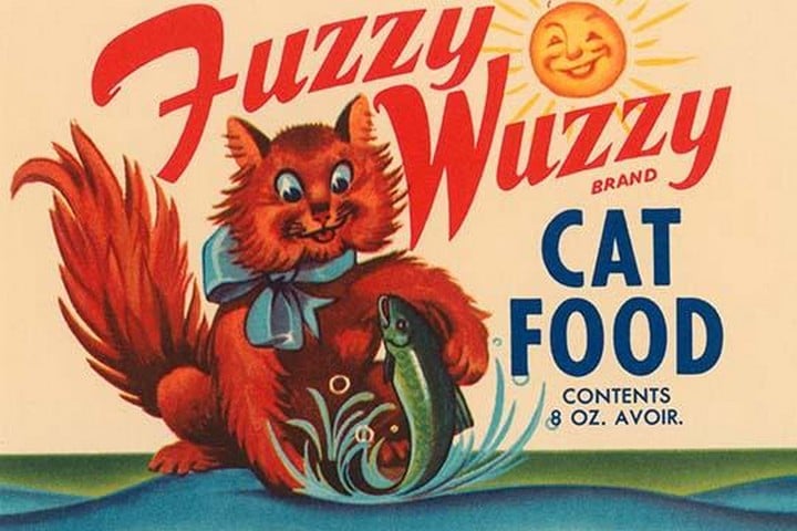 A vintage label for Fuzzy Wuzzy brand cat food. Made by a fish cannery company out of extra fish parts.1930/USA