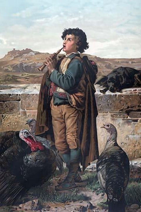 Flautist shepherd calls to gather the flock while he I surrounded by Turkeys in an ad by Birmingham Wind Instrument Co.1900/USA