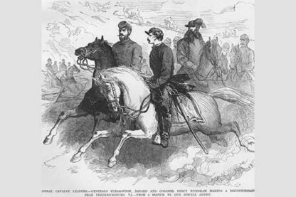 Frank Leslie was a prominent 19th-century American illustrator, publisher, and editor. He started as an illustrator for popular periodicals and established his own publishing company, “Frank Leslie’s Illustrated Newspaper,” which became one of the most successful and influential newspapers of its time. Leslie was also a pioneer in the use of photographs in journalism and established a photographic studio to create original images for his newspaper. He wrote several books and plays and was an important figure in the development of American media, shaping the way news was reported and disseminated. He died in 1880, leaving a lasting legacy.General Pleasanton, Bayard & Colonel Percy Wyndam making a reconnaissance on HorsebackUnknown Date/USA